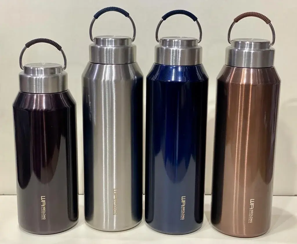 With its sleek metallic finish in multiple elegant colors (black, silver, blue, bronze), the bottle also includes a sturdy steel handle with a comfortable grip, making it easy to carry or clip onto bags.