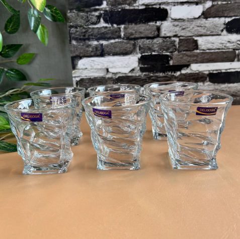 Set of 6 clear glass water glasses.
